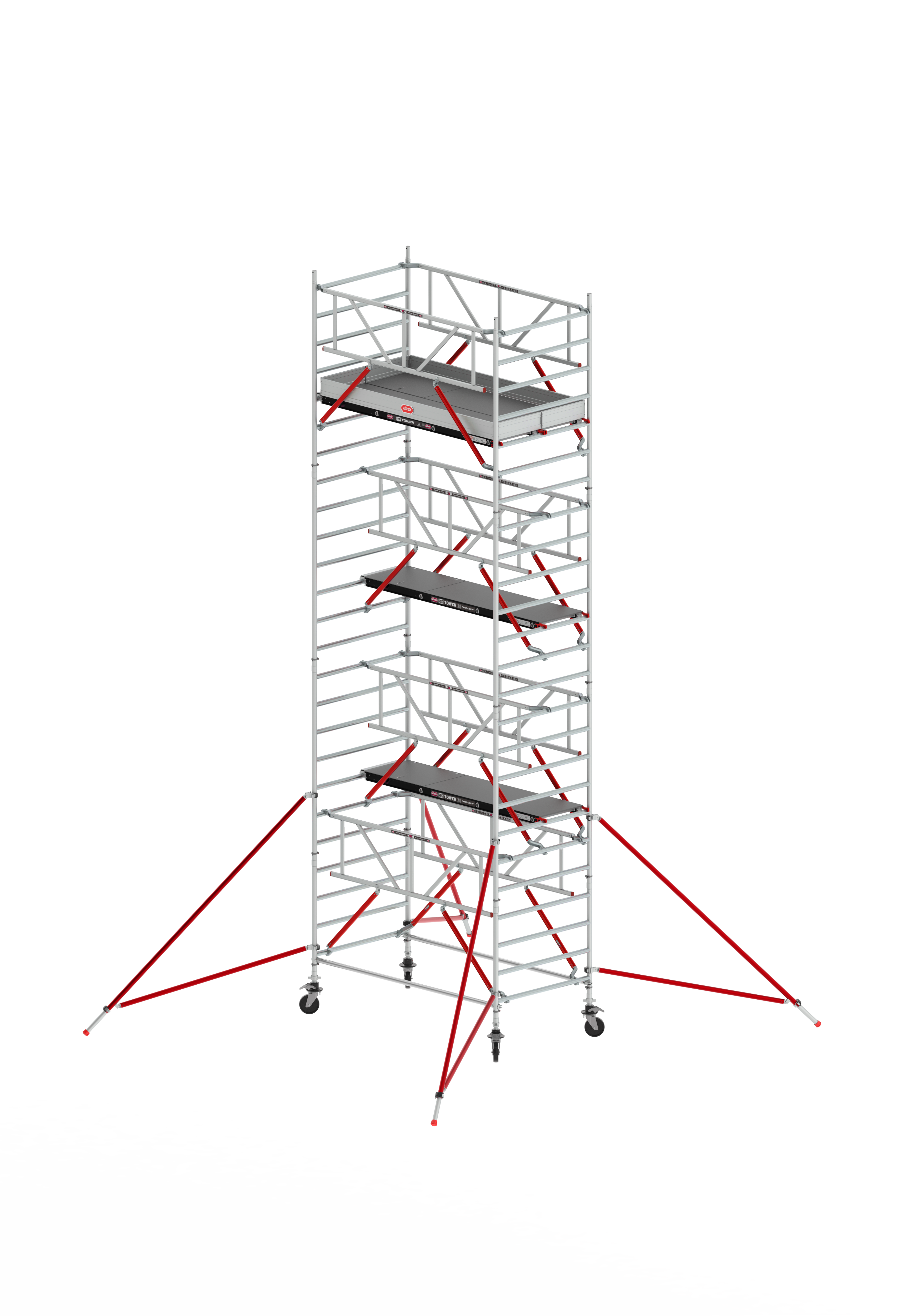 - 6x Bastidor RS TOWER 5 135-28-7 - 2x Bastidor RS TOWER 5 135-28-4 - 4x Brazo ajustable + Rueda RS TOWER 5 Ø 200 mm RS TOWER 5 - 3x Plataforma de madera 305 con trampilla - 1x Plataforma de madera 305 sin trampilla - 8x Barandilla Safe-Quick® 305 RS TOWER 5 - 2x Tirante Horizontal RS TOWER 5 305-8 - 4x Estabilizador Triangular Easy-Lock® universal Rojo - 1x Rodapié Aluminio RS TOWER 5 135 x 305